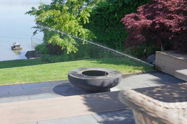 Direkt am Ufer des Zürichsees entfaltet sich eine üppige Gartenlandschaft mit Teich, Wasserpflanzen und schattigen Sitzplätzen. Der naturnah gestaltete Teich mit Fischen fügt sich harmonisch in die Umgebung ein und schafft eine ruhige, beinahe romantische Atmosphäre. Damit Rasen, Blütenpflanzen und Bäume dauerhaft gedeihen, sorgt eine automatisierte Gartenbewässerung für die optimale Versorgung mit Wasser. Leitungen und Bewässerungskanäle verlaufen unterirdisch, während sich Rasensprenger bei Bedarf aus dem Boden erheben und nach getaner Arbeit wieder unsichtbar im Rasen versenken. So bleibt die Technik im Hintergrund – und der Garten kann seine natürliche Schönheit voll entfalten.